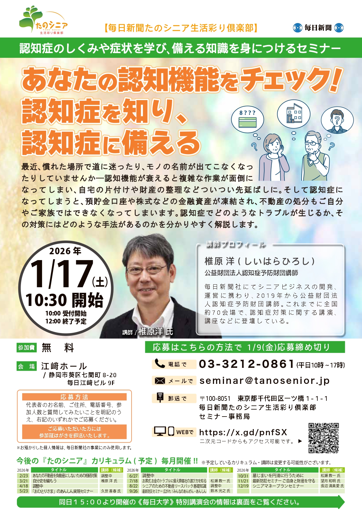 | 【応募方法】 | 代表者のお名前、ご住所、電話番号、参加人数と質問してみたいことを明記のうえ、下記のいずれかでご応募ください。 ➀電話(03-3212-0861) ➁メールアドレス(seminar@tanosenior.jp) ➂郵送:〒100-8051 東京都千代田区一ツ橋1ー1ー1 毎日新聞「たのシニア生活彩り倶楽部」セミナー事務局 ④お申込みフォーム: こちら から、お気軽にお問い合わせください。 *ご応募いただいた方には、参加証はがきを郵送いたします。 *お預かりした個人情報は、毎日新聞社の事業にのみ使用します。 |