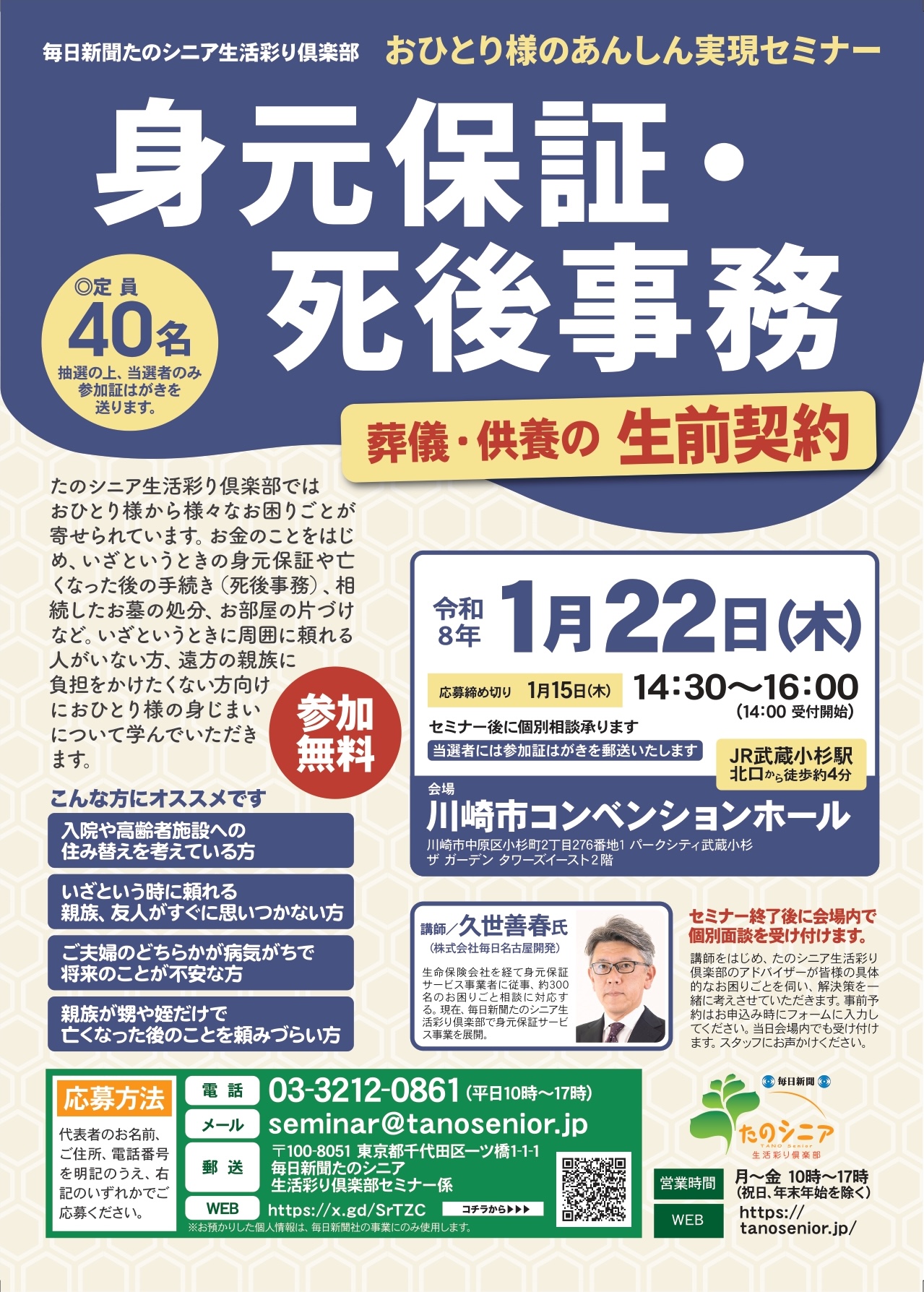 | 【応募方法】 | お名前、メールアドレス、電話番号、郵便番号、ご住所、個別相談希望の有無等を明記のうえ、下記のいずれかでご応募ください。 ➀電話(03-3212-0861) ➁メールアドレス(seminar@tanosenior.jp) ➂郵送:〒100-8051 東京都千代田区一ツ橋1ー1ー1 毎日新聞たのシニア 生活彩り倶楽部セミナー係 ④お申込みフォーム: こちら から、お気軽にお問い合わせください。 *お預かりした個人情報は、毎日新聞社の事業にのみ使用します。 |
