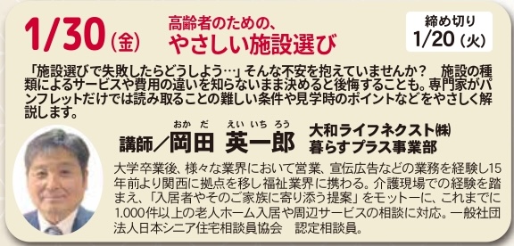 | 【講師】 | 岡田 英一郎(おかだ えいいちろう)氏 大和ライフネクスト㈱ 暮らすプラス事業部 大学卒業後、様々な業界において営業、宣伝広告などの業務を経験し15年前より関西に拠点を移し福祉業界に携わる。 介護現場での経験を踏まえ、「入居者やそのご家族に寄り添う提案」をモットーに、これまでに1.000件以上の老人ホーム入居や周辺サービスの相談に対応。 一般社団法人日本シニア住宅相談員協会 認定相談員 |