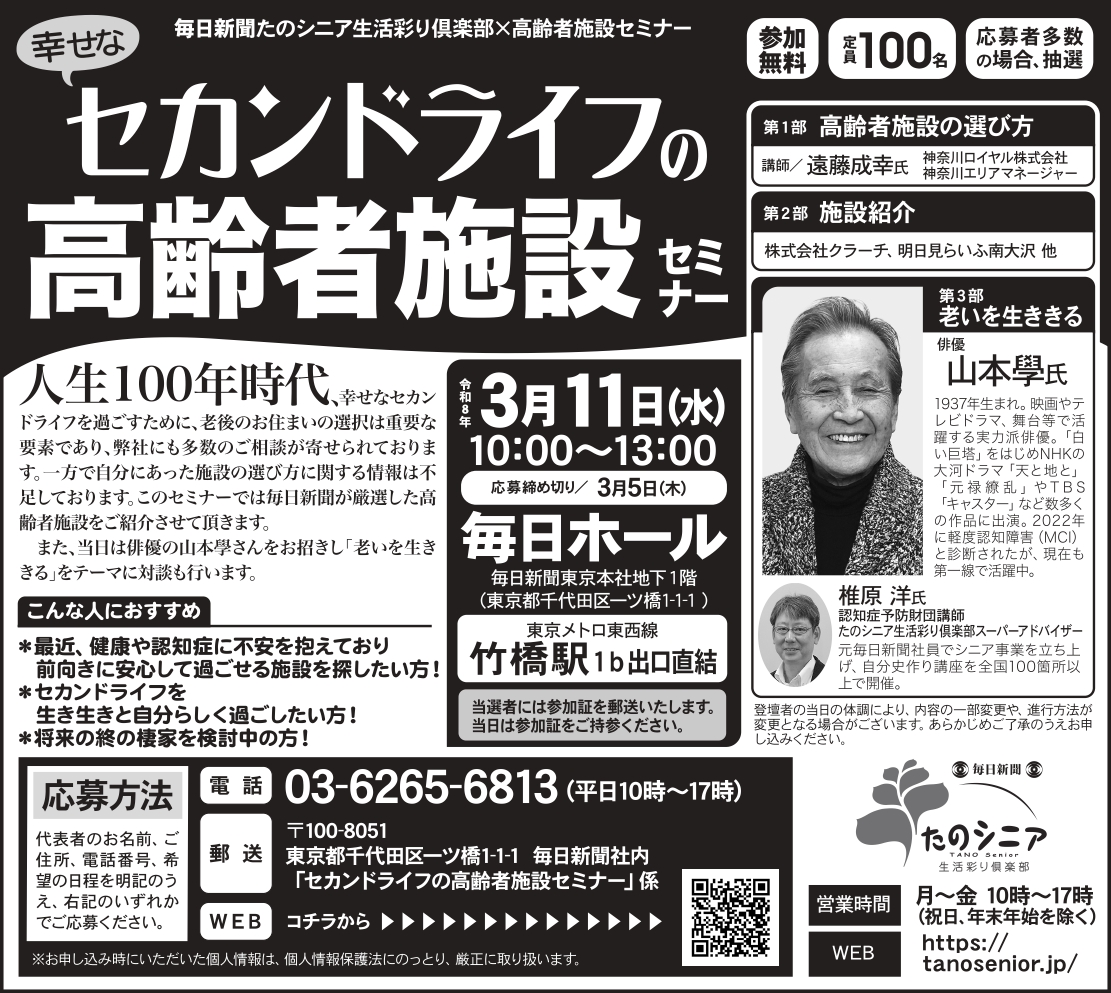 | 【講演プログラム】 | 【第1部】高齢者施設の選び方 講師:遠藤成幸氏(神奈川ロイヤル株式会社 神奈川エリアマネージャー) 【第2部】施設紹介 施設紹介:株式会社クラーチ、明日見らいふ南大沢他 【第3部】老いを生きる 俳優/山本 學氏 1937年生まれ。映画やテレビドラマ、舞台等で活躍する実力派俳優。 「白い巨塔」をはじめNHKの大河ドラマ「天と地と」「元禄繚乱」やTBS「キャスター」など数多くの作品に出演。 2022年に軽度認知障害(MCI)と診断されたが、現在も第一線で活躍中。 椎原 洋氏 (認知症予防財団講師/毎日新聞たのシニア生活彩り倶楽部・スーパーアドバイザー) 元毎日新聞社員でシニア事業を立ち上げ、自分史作り講座を全国100箇所以上で開催。 ※登壇者の当日の体調により、内容の一部変更や、進行方法が変更となる場合がございます。あらかじめご了承のうえお申し込みください。 |