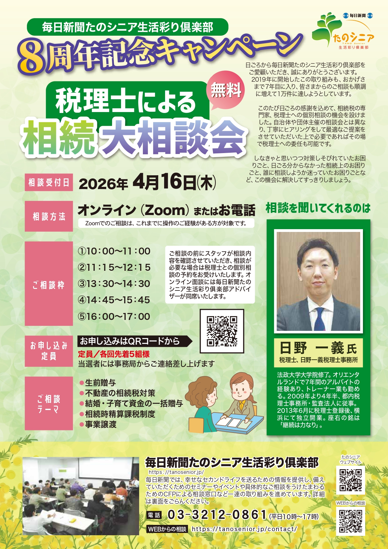【Zoom/電話】毎日新聞たのシニア生活彩り俱楽部_8周年記念キャンペーン_税理士による相続第相談会開催!