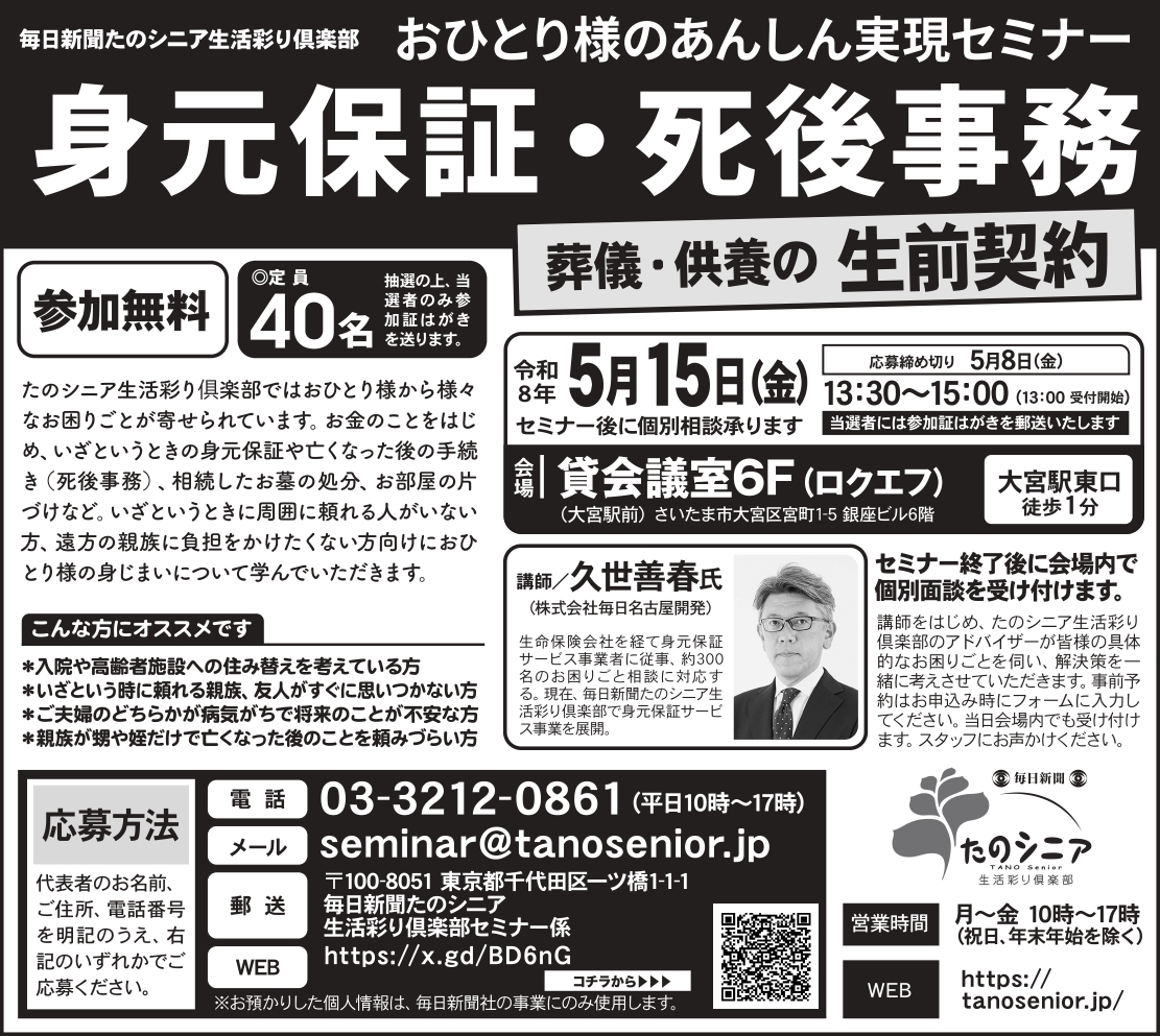 | 【応募方法】 | お名前、メールアドレス、電話番号、郵便番号、ご住所、個別相談希望の有無等を明記のうえ、下記のいずれかでご応募ください。 ➀電話(03-3212-0861) ➁メールアドレス(seminar@tanosenior.jp) ➂郵送:〒100-8051 東京都千代田区一ツ橋1ー1ー1 毎日新聞社たのシニア 生活彩り倶楽部セミナー係 ④お申込みフォーム: こちら から、お気軽にお問い合わせください。 *お預かりした個人情報は、毎日新聞社の事業にのみ使用します。 |